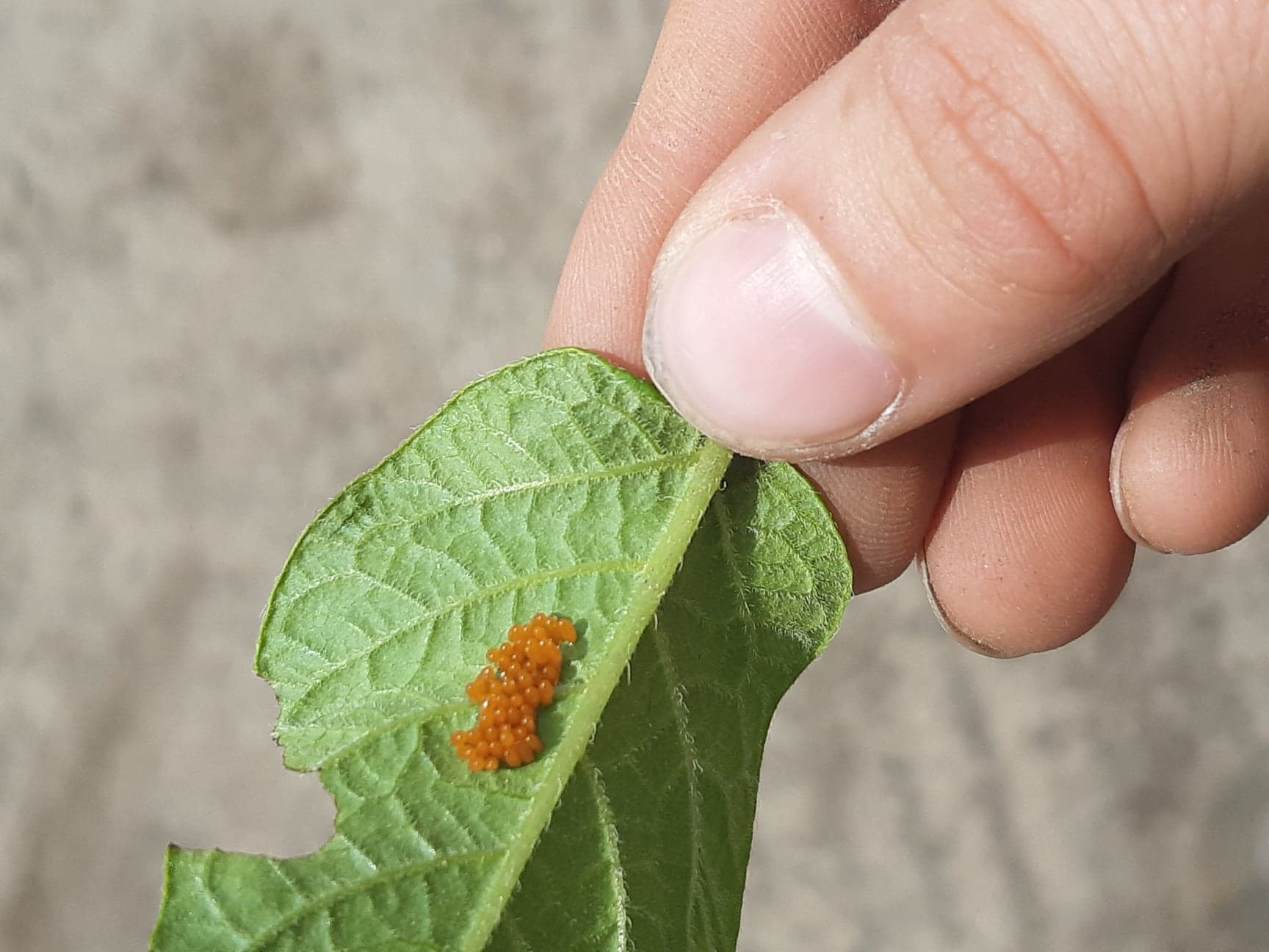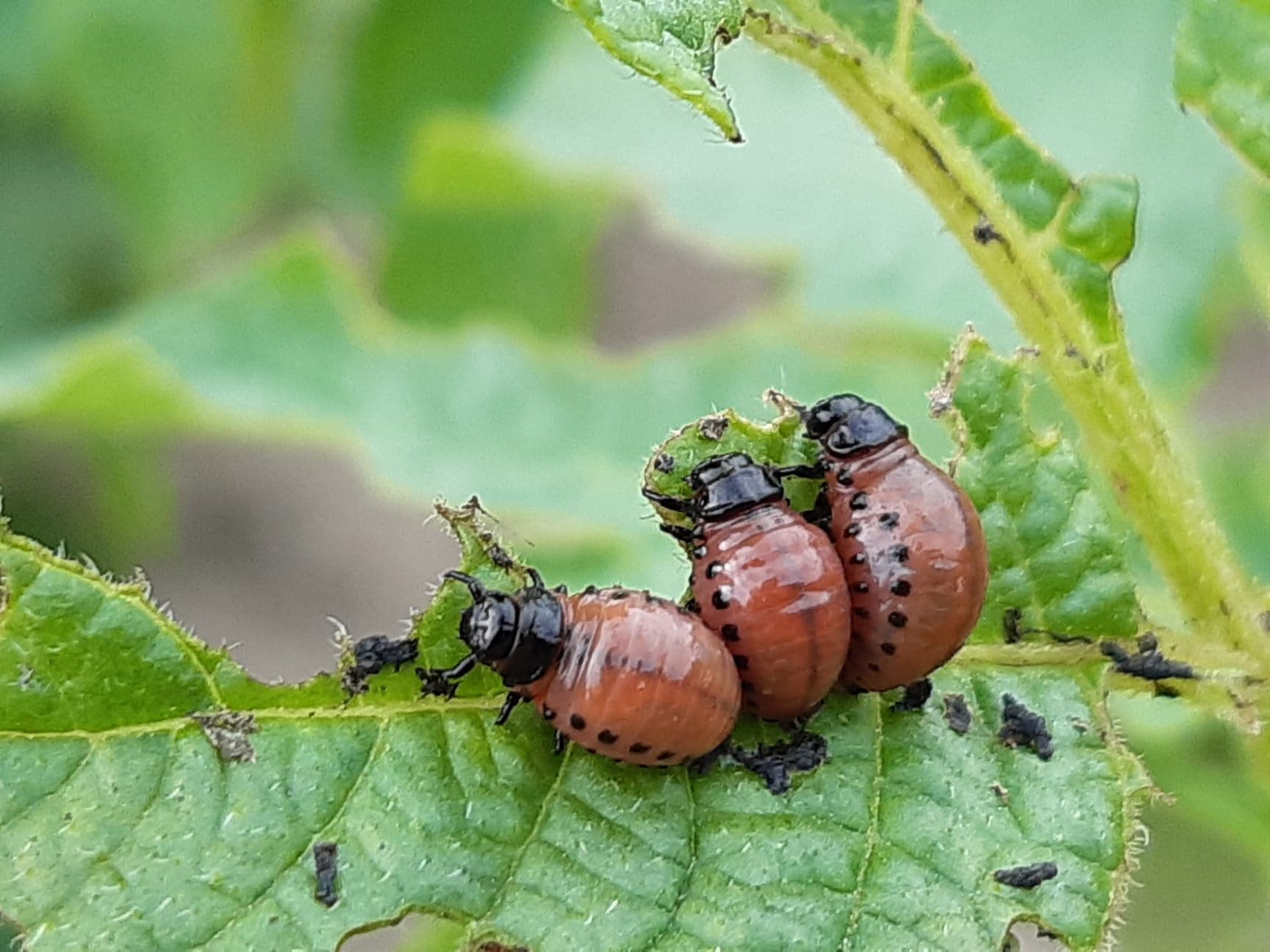 W ziemniakach żeruje stonka ziemniaczana. Są widoczne chrząszcze wiosenne, jaja, a także larwy tego szkodnika.